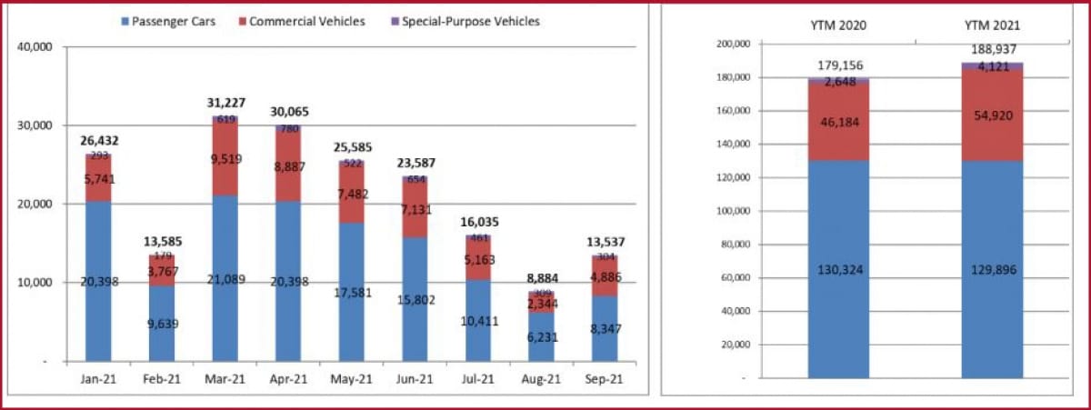Cũng tính đến hết tháng 9/2021, doanh số bán hàng của xe lắp ráp trong nước giảm 6% trong khi xe nhập khẩu tăng 26% so với cùng kì năm ngoái.